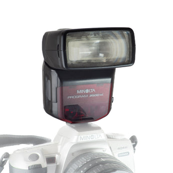 Advanced flash for Minolta with iISO hot shoe. Guide number 35 (ISO 100, 105mm). Auto zoom 28-105mm, tilt 90°, wireless sync.